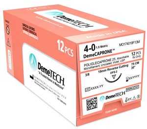 DemeTech's fast absorbing Poliglecaprone 25 is made of a synthetic absorbable monofilament composed of glycolide and e-caprolactone copolymer (same as Monocryl). Box/12