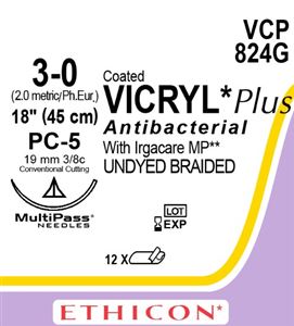 VICRYL PLUS SUTURES 3.0 19MM PC-5 45CM 12'S VCP824G ( Previously W9511T )