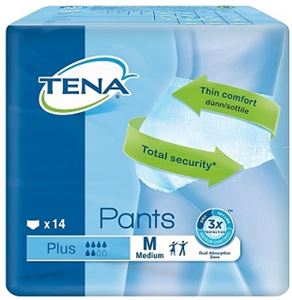 Designed for moderate to heavy urine loss, TENA Pants Plus are extra secure and worn like normal underwear. The exceptional security is due to the FeelDry technology which rapidly absorbs even large quantities of urine into the core and away from the skin so that, even when seated or lying down for long periods of time, the wearer will stay dry and comfortable and the risk of skin rashes and infections is significantly reduced.