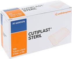 Cutiplast*Steril is a soft conformable sterile island dressing especially useful in areas of curvature and flexion such as knees and elbows, hirsute areas and in situations of high humidity as the porous material breathes. Consists of a non-lint low adherent wound pad covered with hypoallergenic Fixomull.